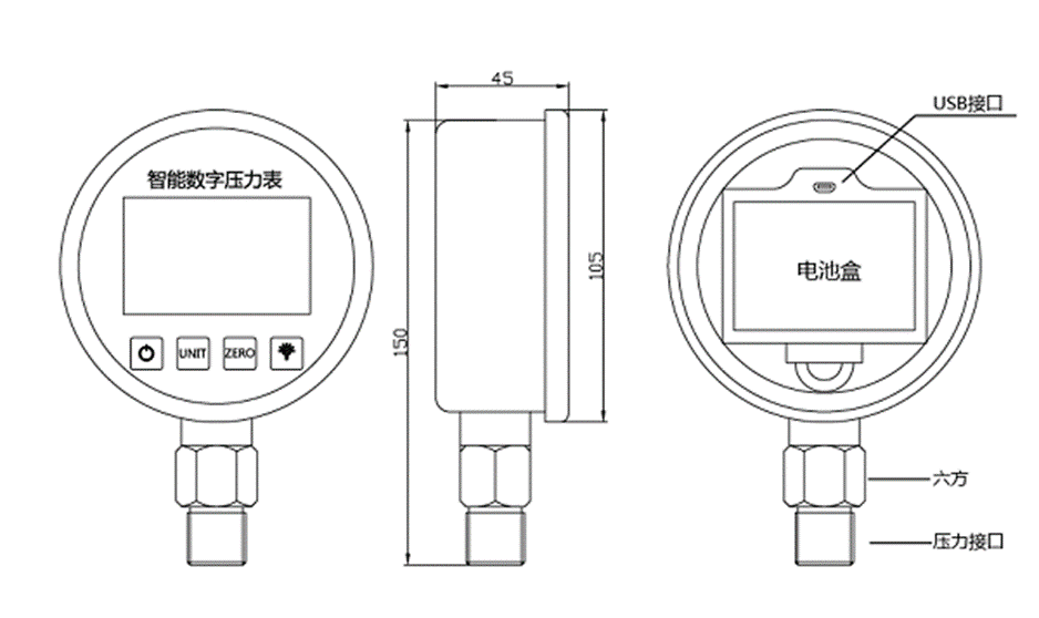 SUAY80压力开关是一款高精度智能型数字压力表,内置高精度压力传感器,能够准确的实时显示压力,并且具有精度高、长期稳定性好的特点。配备5位显示的大尺寸LCD液晶显示,具有清零、背光、开关机、单位切换、低电压报警、峰值记录等多种功能,操作简单,安装方便。壳体和接头采用304不锈钢,抗震性好,能够测量气体、液体、油等对不锈钢无腐蚀的介质。用3节5号电池供电,也可以采用USB供电,续航功耗低、时间长,适用于便携式压力测量、设备配套、校验设备等压力测量领域。